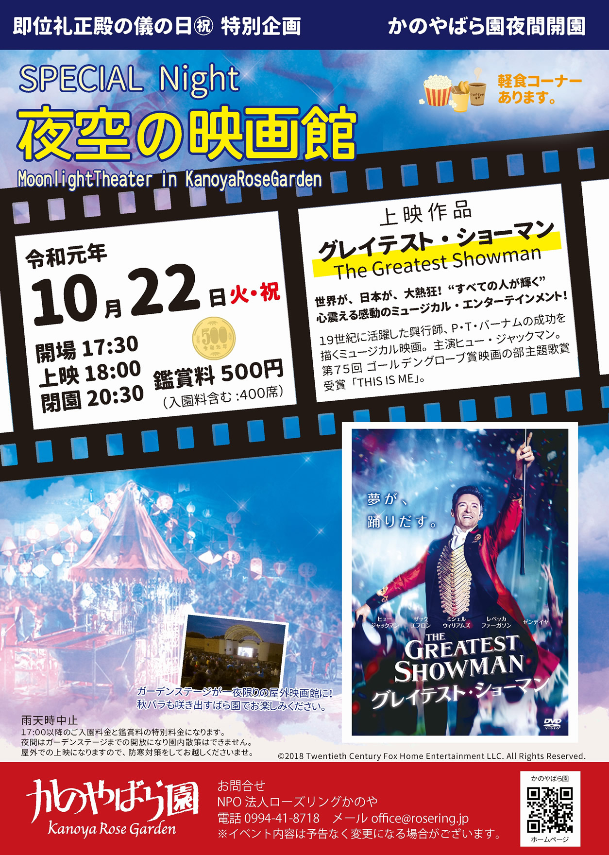 10月22日(火・祝)、かのやばら園が一夜限りの野外映画館となる。