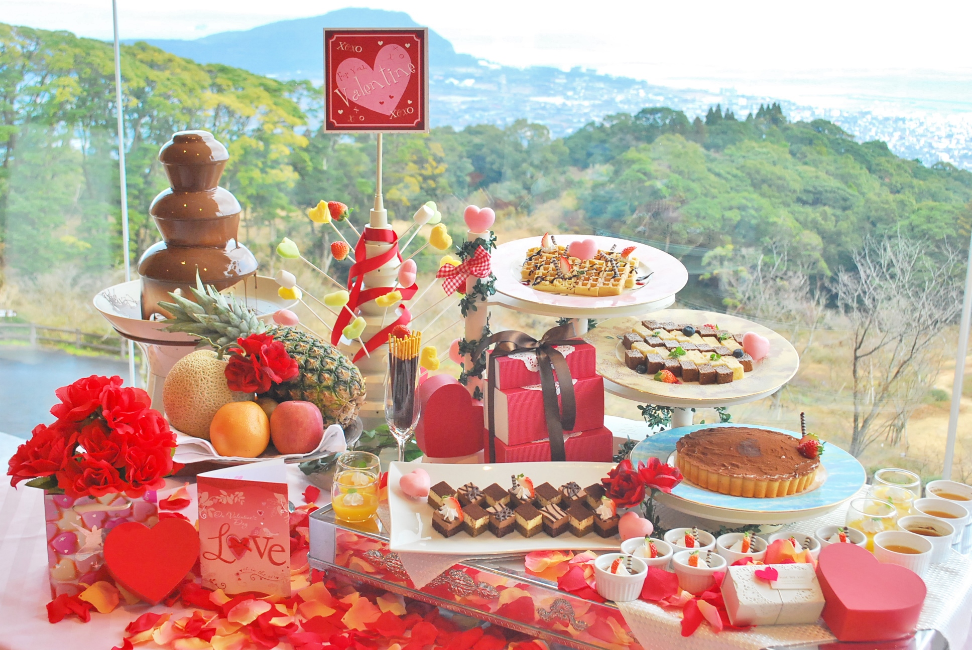 2月は...バレンタインフェア♪チョコフォンデュやガトーショコラなど、チョコレートを使ったスイーツが充実するほか、チキンソテーチョコバルサミコソースなど特別メニューも登場。