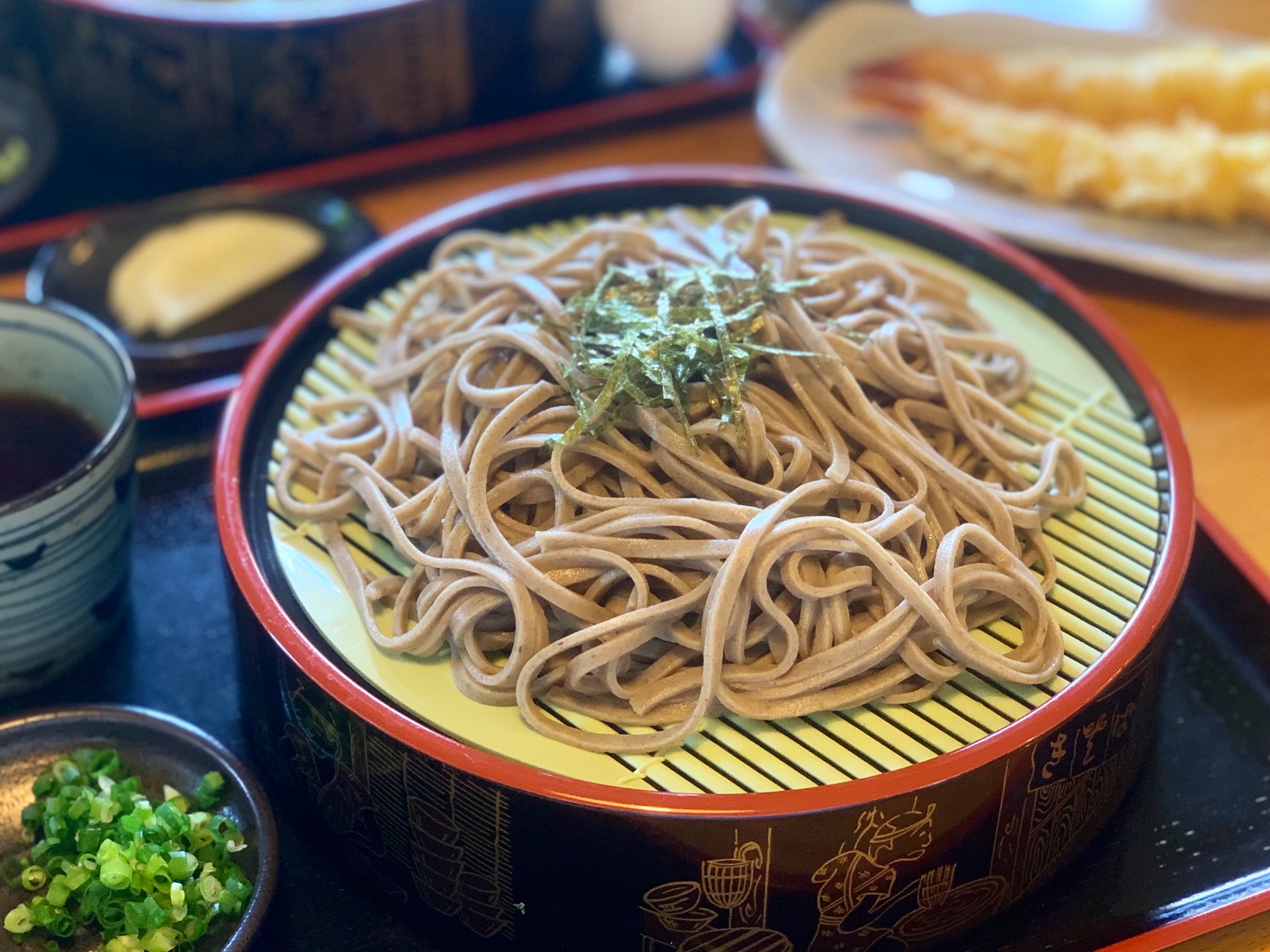天ざる蕎麦。海老天が2つ付いて食べ応えも十分。