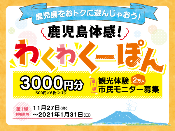 鹿児島市民がお得に遊べるクーポン「鹿児島体感!わくわくーぽん」3,000円分がもらえる市民モニターを募集中。