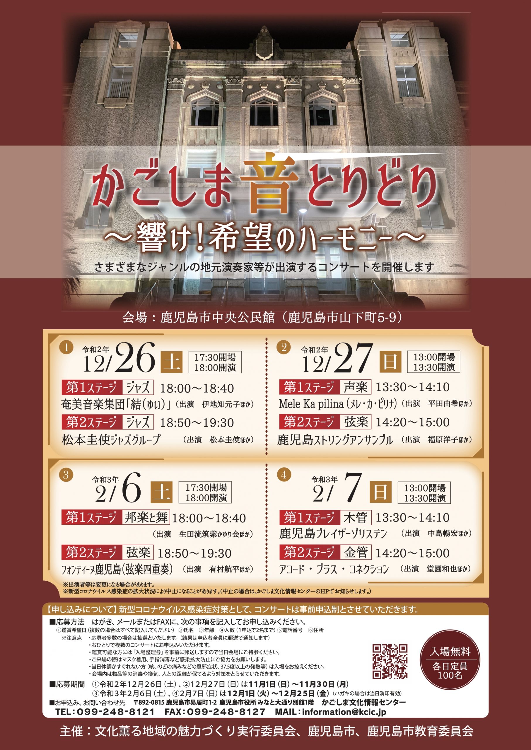 2020年12月26(土)より開催される「かごしま音とりどり~響け!希望のハーモニー~」は、さまざまなジャンルの地元演奏家が出演するコンサートを無料で楽しめる企画。事前申し込みが必要で、応募者多数の場合は抽選となる。