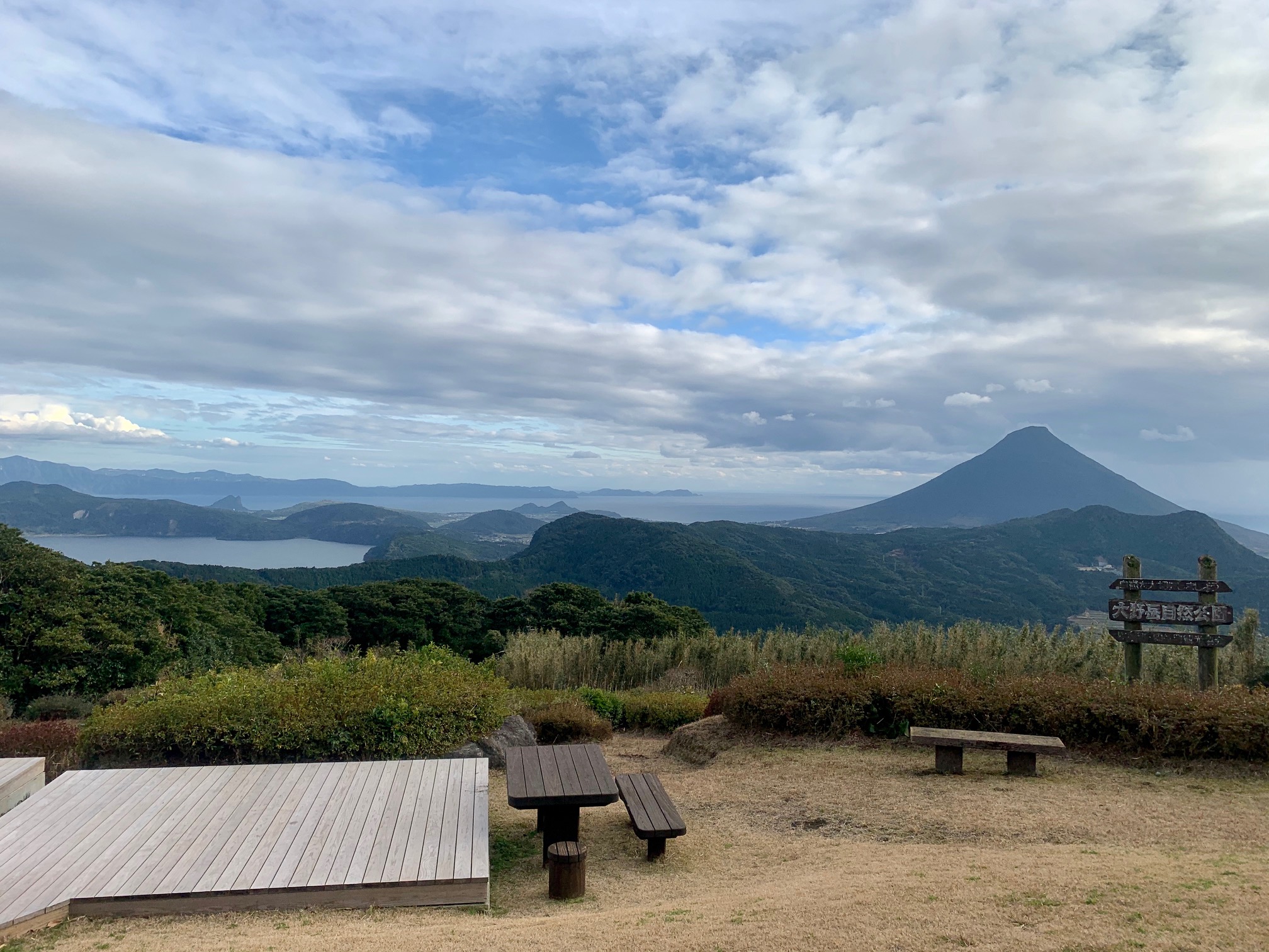 薩摩半島南部にある標高466mの大野岳。山頂からは360度の眺望を見渡すことが出来る。開聞岳や池田湖、茶畑など薩摩半島を代表する景観を望み、晴れて見晴らしがいい日には硫黄島や屋久島を見ることも出来る。