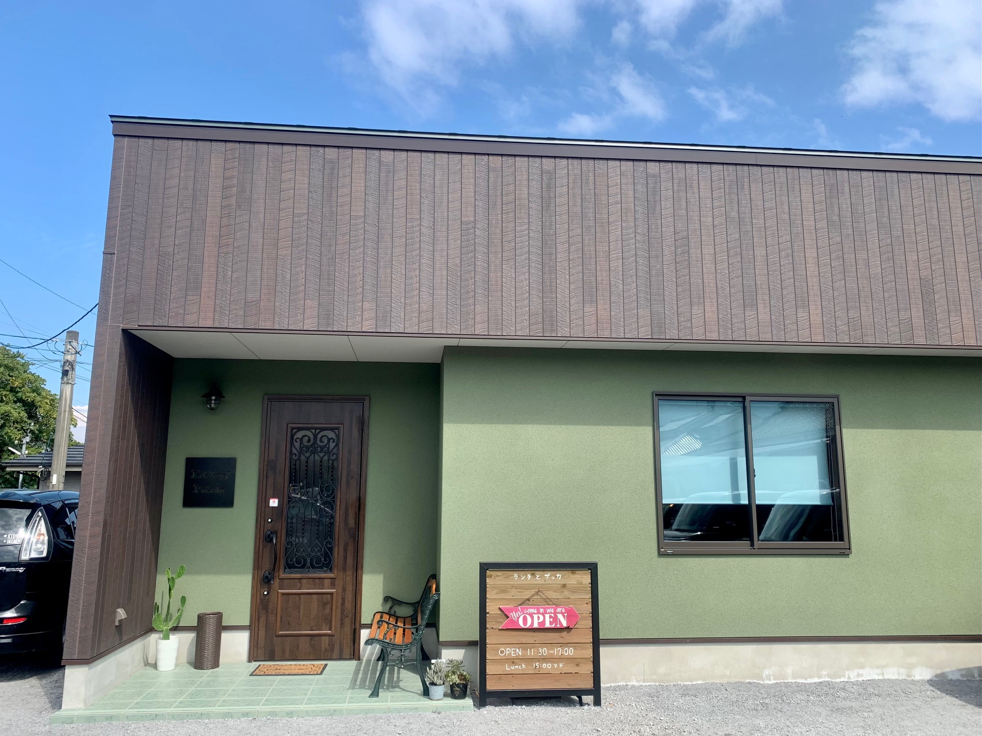 緑色の建物が目を引く、可愛らしい外観。