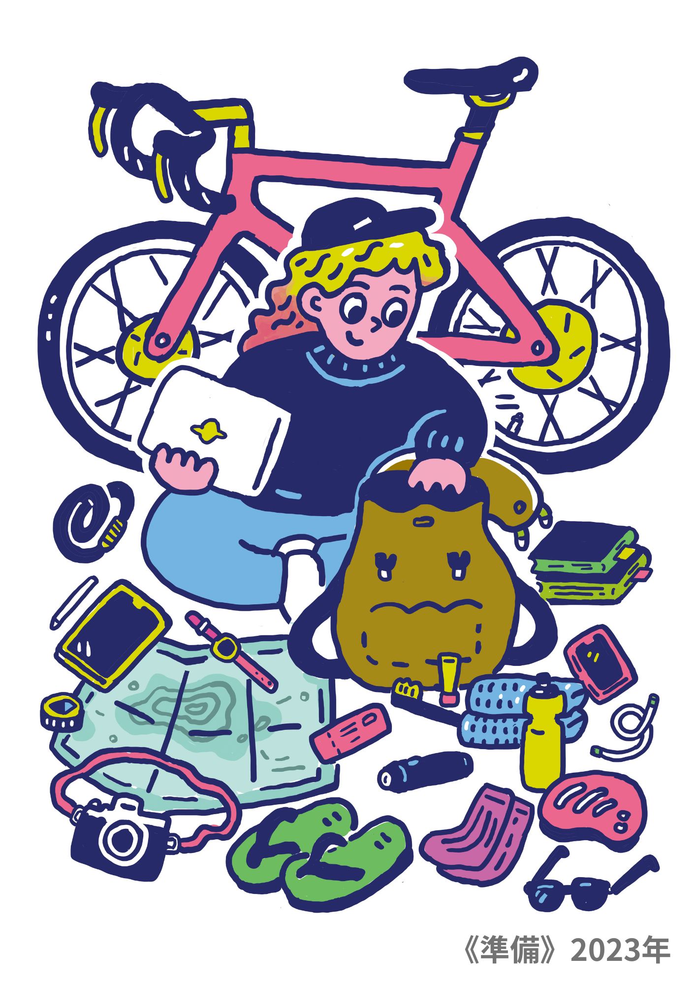 今回の個展は「離島・ノマド・自転車」をキーワードに、旅する視点で豊かな離島の魅力を伝えます。自身のルーツでもある漫画的な表現とイラストレーションの境界を探り、表情豊かに紡がれた物語性のある作品は,新たな旅の予感と可能性を感じさせます。