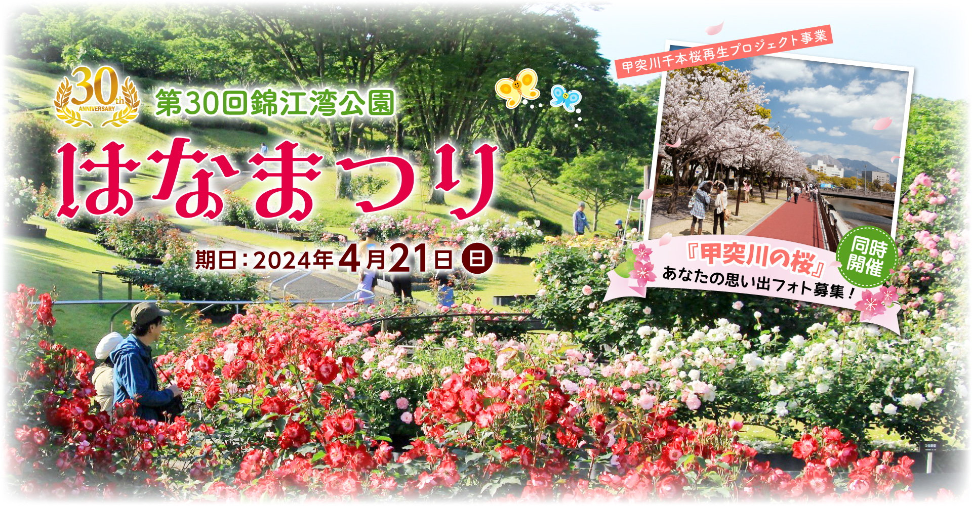 バラが見頃を迎える4月21日(日)に錦江湾公園ではなまつりが開催されます。当日は花と緑の講習会やハローキティのミニステージ、花苗の無料配布など、以下のイベントが開催されます。ご家族でおでかけしてみてはいかがでしょうか。