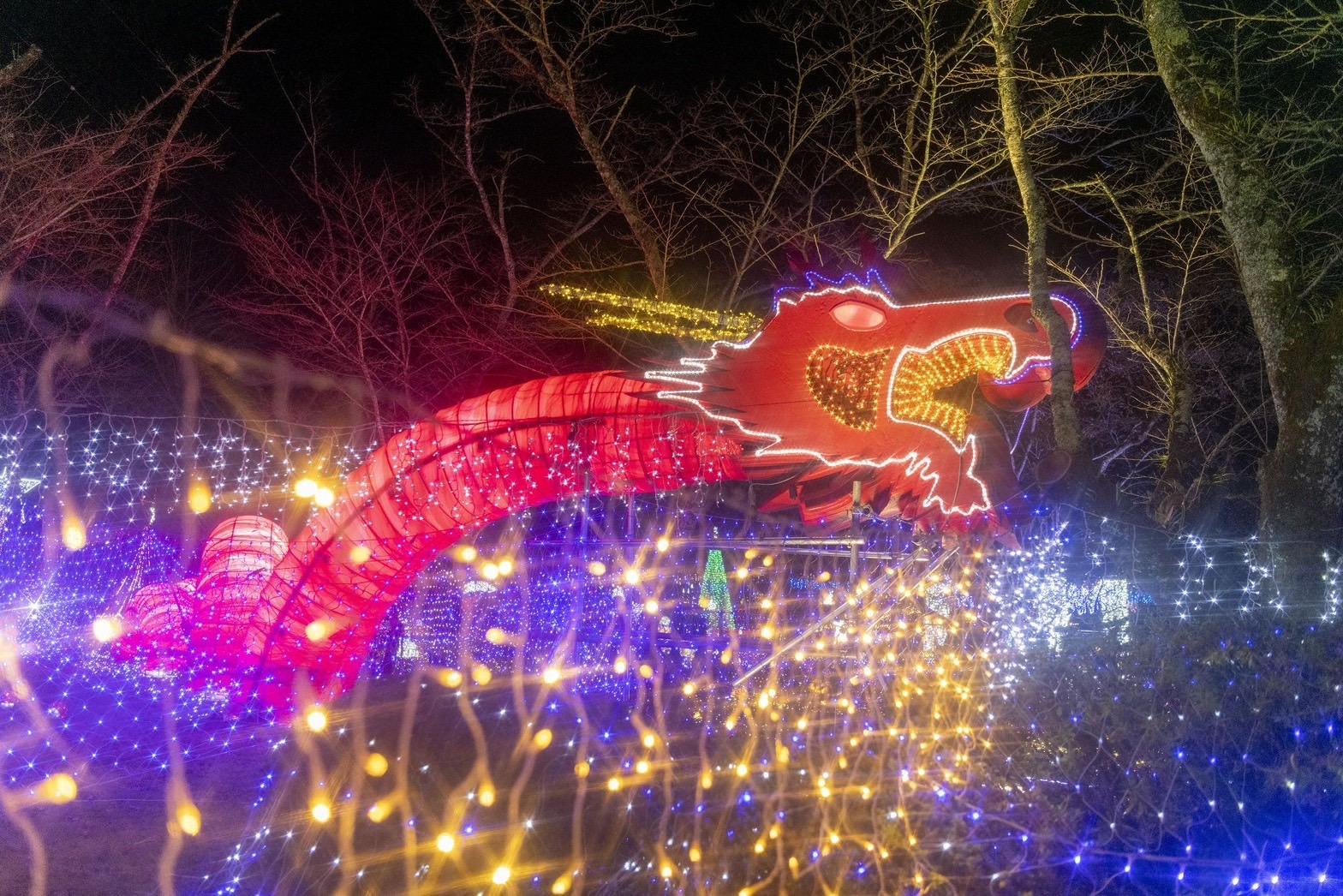 目玉は、天に昇る大蛇を表現した迫力満点のライトアップ。