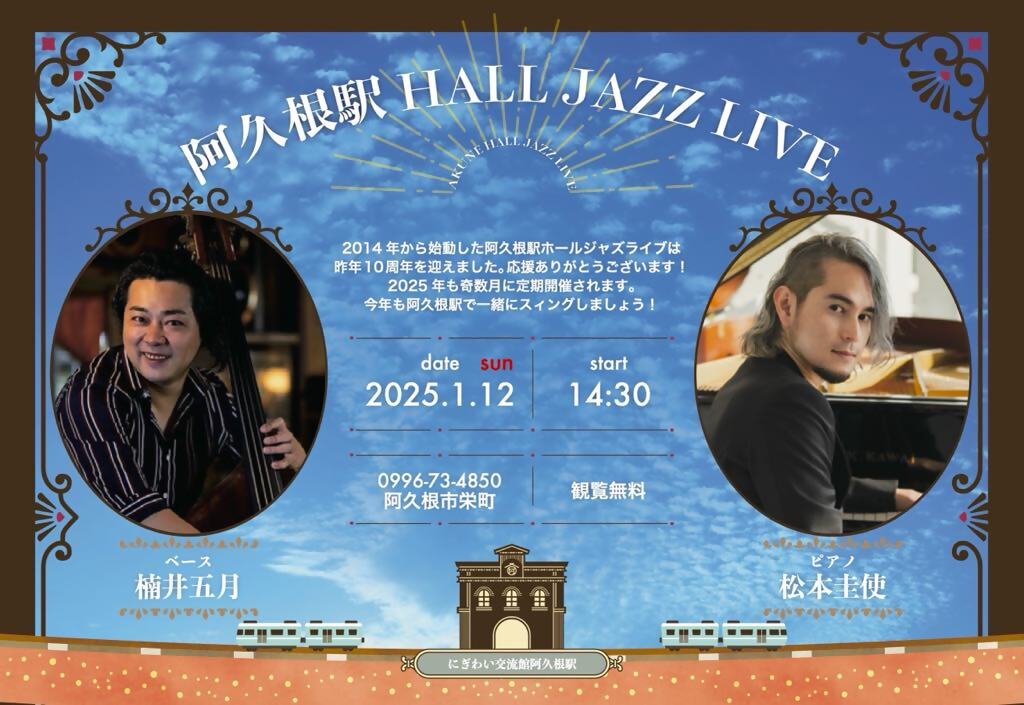 阿久根駅で開催される「阿久根駅 HALL JAZZ LIVE」は、2014年から始まり、昨年10周年を迎えた定期イベントである。