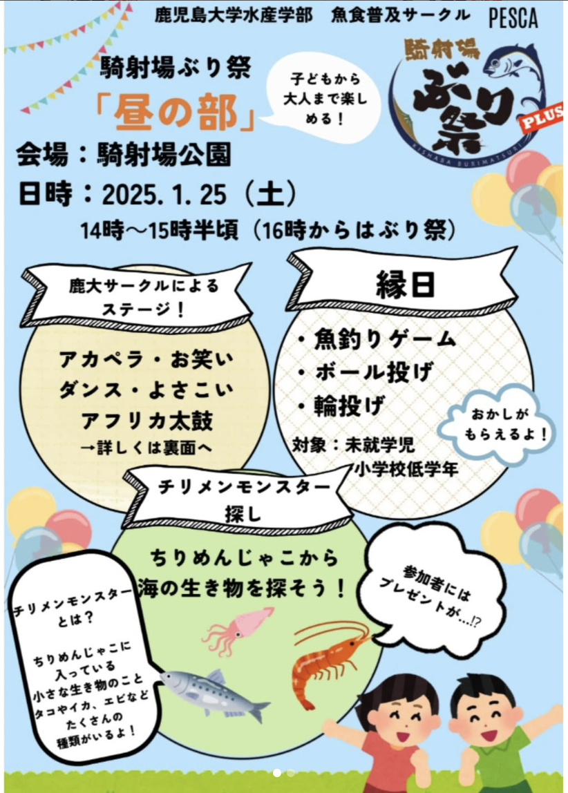 このイベントは、鹿児島大学水産学部の魚食普及サークル「PESCA」が主催し、地域活性化と魚食普及を目的としている。