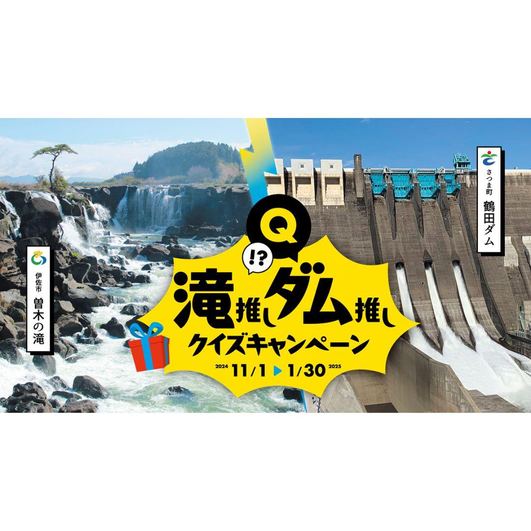 伊佐市とさつま町が共同で開催する「滝推し・ダム推しクイズキャンペーン」は、曽木の滝(伊佐市)と鶴田ダム(さつま町)を訪れ、各所に設置されたポスターのQRコードを読み取ってクイズに挑戦するイベントである。